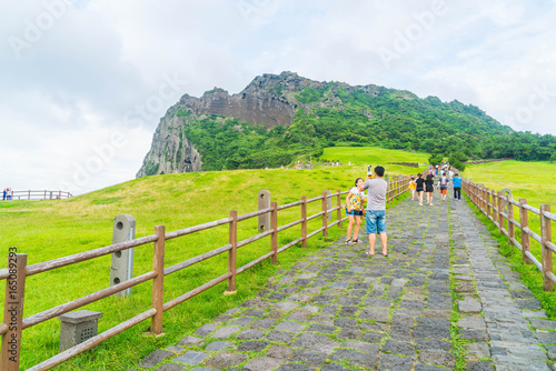 JEJU, KOREA - JULY 9, 2017:The tourist visited Seongaksan Mountain, the famous scenic views in Jeju island