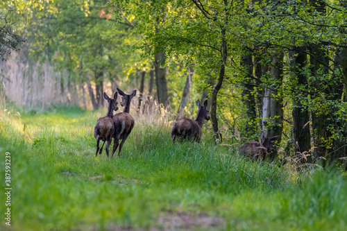 Jelenie szlachetne Cervus elaphus i zielona trawa, zwierzęta uciekają przez las