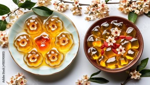 Jelly Dessert with Osmanthus Flowers in Decorative Bowls Surrounded by Blossoms