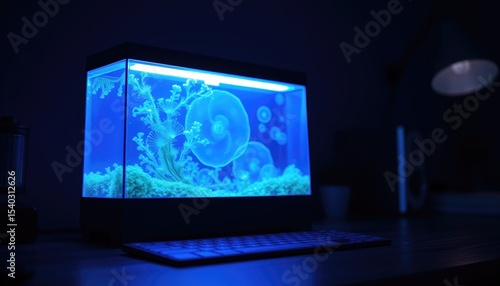 Jellyfish aquarium illuminated with blue light on wooden desk