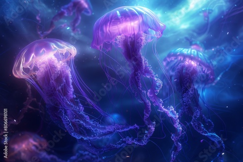 Jellyfish with glowing tentacles, creating a sense of depth and movement as they drift through an invisible ocean