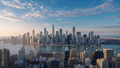 Jersey city skyline reflecting on hudson river at sunset with dramatic clouds