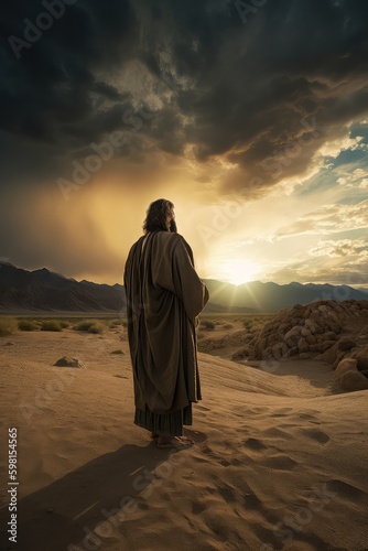 Jesus after the resurrection, Jesus is risen bible verse, Jesus praying, Jesus doing meditations, Jesus at night, Jesus with followers, dramatic environment, dramatic lighting, desert lighting