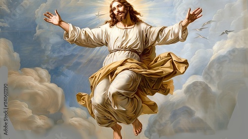 Jesus christ ascending to heaven surrounded by radiant clouds in a divine celestial scene