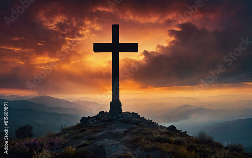 Jesus Christ cross, Christian cross on a background of dramatic sky and fog landscape, sunset