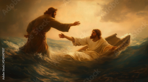 Jesus Christ help sink boat in ocean reach hand to Peter. God holy spiritual gospel salvation faith grace. Sin redemption resurrection crucifixion heaven. Worship disciples Kingdom God forgiveness.