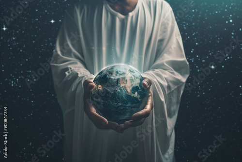 Jesus Christ in a white robe holding Planet Earth, with a universe filled with stars in the background. Environmental stewardship, global sustainability, and eco-friendly responsib