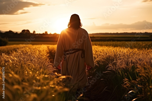 Jesus, Christ, Lord walking in a beautiful field in a sunset, paradise, holy