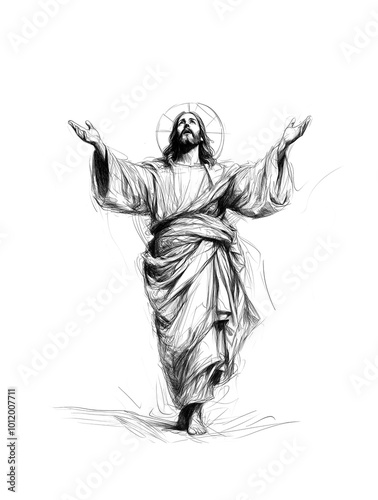Jesus Christ resurrection with open arms. Illustration doodle sketch style. transparent background PNG.