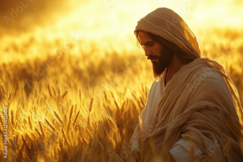 Jesus Christ walking through a golden wheat field with a serene and peaceful expression during a moment of reflection in nature