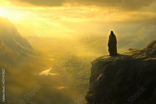 Jesus standing on a cliff edge gazing over a golden valley illuminated by radiant sunlight