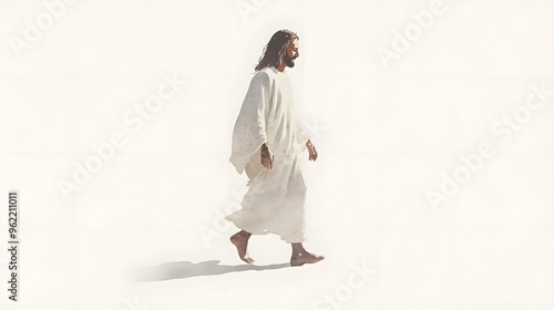 Jesus walking, white background, watercolor style, simple lines, white robe, long hair and beard