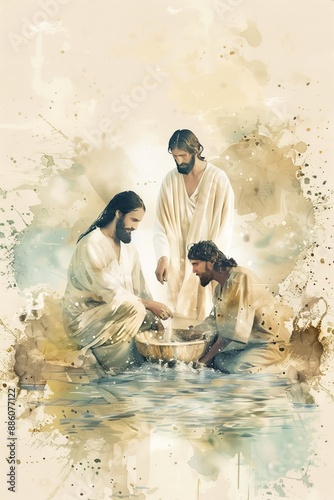 Jesus washing feet illustration on Maundy Holy Thursday. Two figures in religious context, kneeling and standing. Watercolor style with neutral background, beige colors. Dreamy atmosphere.
