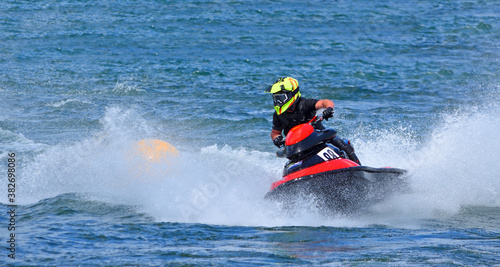 Jet Ski racer creating at lot of spray black and red jet-ski .
