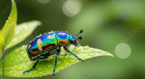 Jewel beetle on leaf, covered in water droplets, soft bokeh background