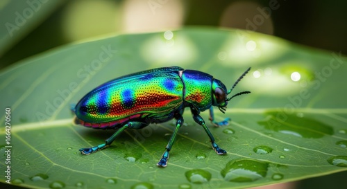 Jewel Beetle on Leaf: Macro Shot of Iridescent Insect with Water Droplets