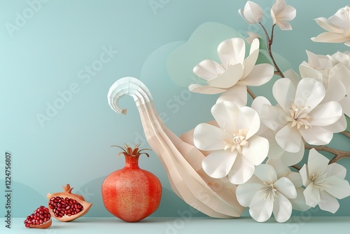 Jewish New Year, rosh hashanah, design concept on paper,Paper art flowers with pomegranate, apple, and shofar design, extreme right third of an image,