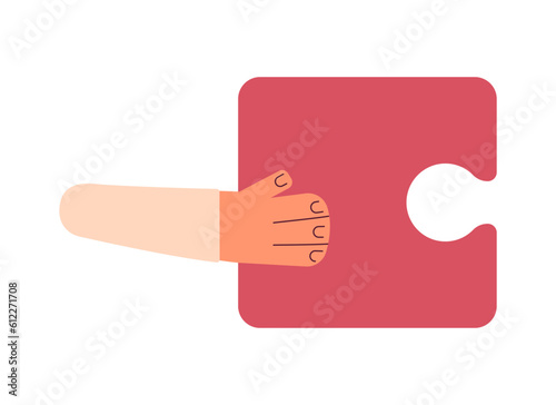Jigsaw puzzle holding semi flat colorful vector hand. Problem solving. Education leisure. Puzzle game. Attach piece. Editable element on white. Simple cartoon spot illustration for web graphic design