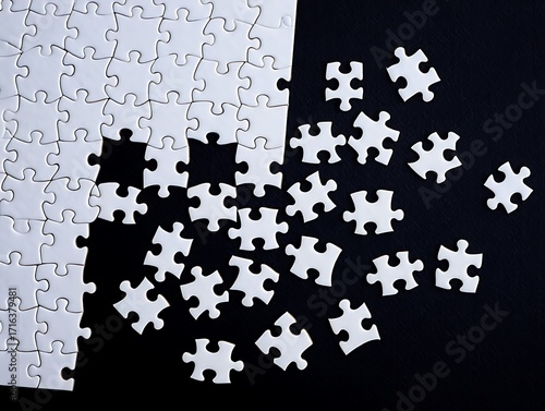 Jigsaw puzzle pieces scattered and assembled on a dark surface overhead view