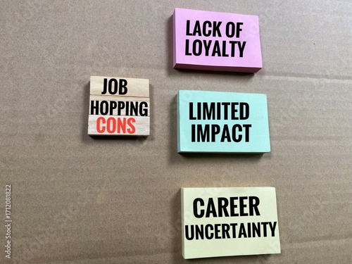 Job Hopping Cons include Lack of Loyalty, Limited Impact, and Career Uncertainty written on multicolored sticky notes.