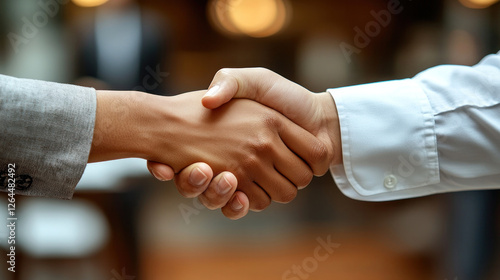 Job interview scene in a sleek office, with a candidate confidently shaking hands with an interviewer