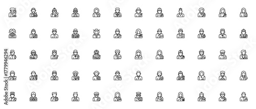 Jobs and Occupations icon set. Vector profession icos pack. Includes worker, tacher, engineer, nurse, chf, mechanic, artist, drive, scientist and more. Editble stroke.
