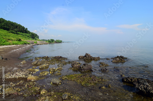 Jodo beach scenery background in the stem area (Central Java). with two views, land and sea. there are beach rocks, beach sand, bright blue sky, and some plants along the coast