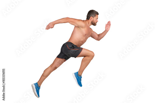 Jogger run at sport training isolated on white. Morning sport workout runner running. Sportsman man running. Running man with muscular torso. Runner at long sport run, endurance