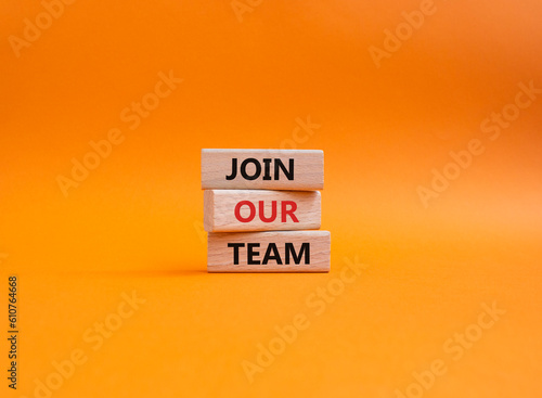 Join our team symbol. Wooden blocks with words Join our team. Beautiful orange background. Business and Join our team concept. Copy space.