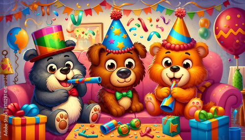 Join the fun as these adorable party animals celebrate with joy, confetti, and balloons! Watch them enjoy the party with their festive hats and noisemakers, spreading cheer all around