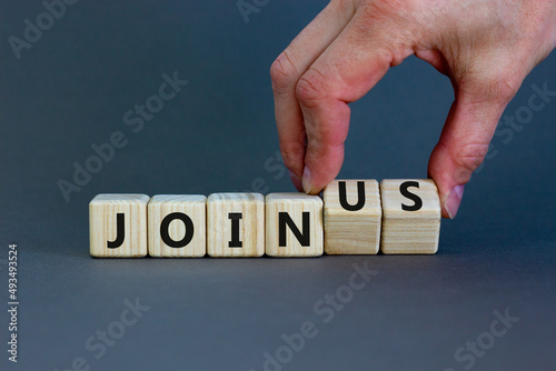 Join us symbol. Businessman turns wooden cubes and changes concept words Join to Join us. Beautiful grey background. Business support and join us concept. Copy space.