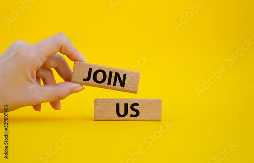 Join us symbol. Concept word Join us on wooden blocks. Beautiful yellow background. Businessman hand. Business and Join us concept. Copy space