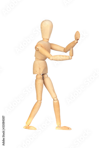 Jointed wooden mannequin pushing something