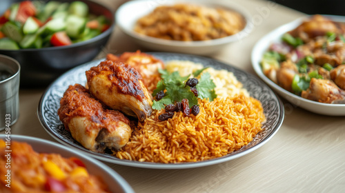 Jollof rice with spiced chicken served with assorted vegetables and side dishes