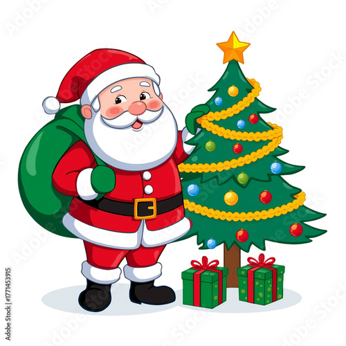 Jolly santa claus with gift bag and decorated christmas tree with presents