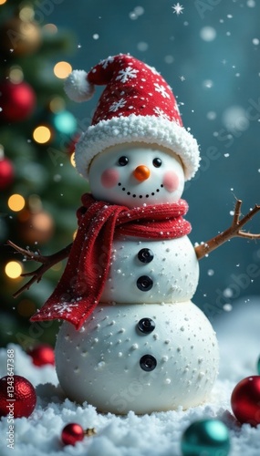 Jolly snowman with a large snowflake and red hat, surrounded by festive Christmas decorations, holly berries, winter wonderland, festive atmosphere