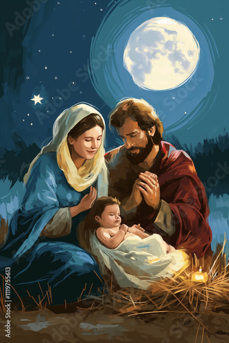 Joseph, Mary and Baby Jesus in the crib, nativity scene in the Bethlehem, beautiful art. Christmas holidays greeting card with Holy family.