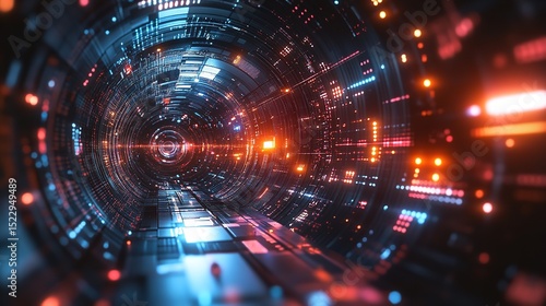 Journey through a futuristic digital tunnel navigating the vibrant data stream with glowing red and