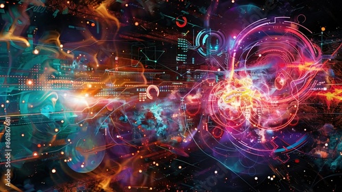 Journeying Through the Digital Cosmos Abstract Multimedia Communication in Cyber Space, Depicting a Technologically Advanced Networked World