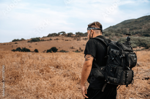 Joven explorador fotografo camina por medio de un valle seco en la naturaleza con su equipo fotografico