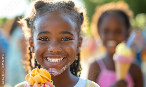 joyful african american girl smiles brightly, savoring ice cream at a lively summer park party with friends under the midday sun, a candid close-up portrait of pure bliss.