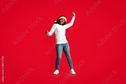 Joyful african american lady in Santa hat having fun