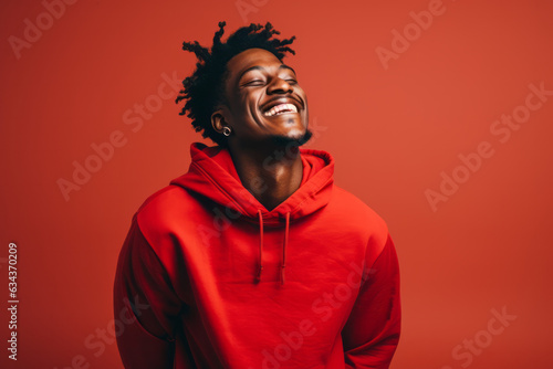 Joyful African American man posing against vibrant red studio backdrop - close-up portrait