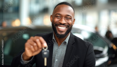 Joyful African American Man Rejoices In New Car Purchase At Dealership, Holding Key In Contemporary Showroom Setting. Excitement Abounds.