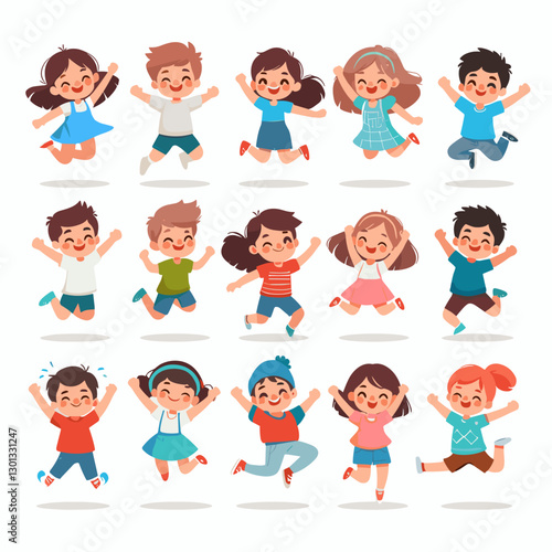 Joyful and diverse group of cartoon children jumping with excitement, perfect for educational materials, children's books, and promoting positive themes.