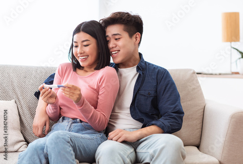 Joyful Asian Couple Holding Positive Pregnancy Test Sitting At Home