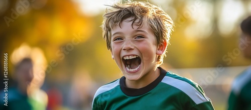 Joyful boy in green soccer jersey laughs outdoors.