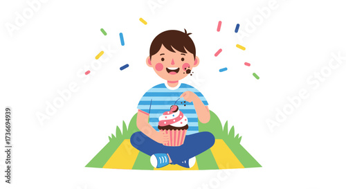 Joyful Boy Relishes Cupcake Delights Underplay with Sweetened Sprinkles in Delightful Scene