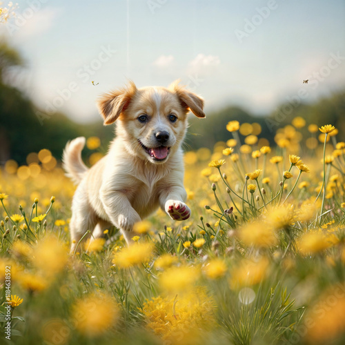 Joyful Brown Puppy Running Through Yellow Wildflowers Against Sunny Background