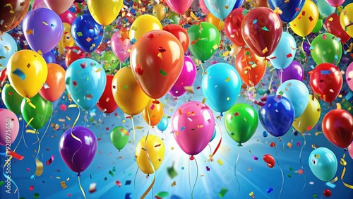 Joyful celebratory moment captured with vibrant balloons, confetti, and colorful streamers suspended in mid-air, exuding excitement and elation, perfect for festive occasions.